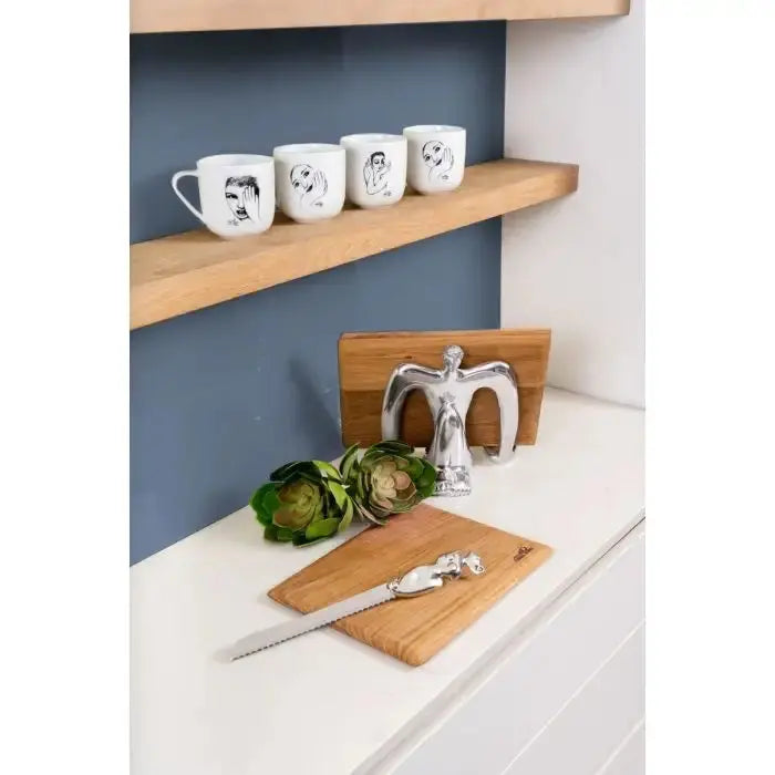 Indulge in the luxurious sophistication of our Woman bread knife. Expertly designed to delicately slice through your baked goods, its pewter handle and stainless steel, serrated edges create a seamless cutting experience. With a feminine form that exudes elegance, this knife is a must-have for any refined kitchen.