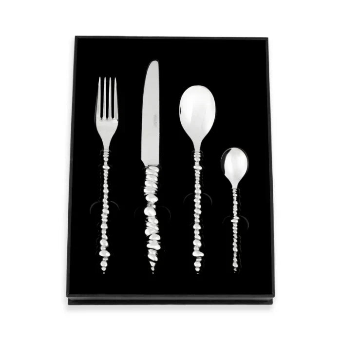 This elegant 4-piece cutlery collection features artfully sculpted handles that make each dining moment memorable. The set comprises a table knife, fork, tablespoon, and teaspoon, all forged from durable 18/8 stainless steel with a lustrous mirror finish. Designed for both everyday refinement and special occasions, these pieces resist tarnishing and withstand regular dishwasher cycles, ensuring lasting beauty and practicality for your table.
